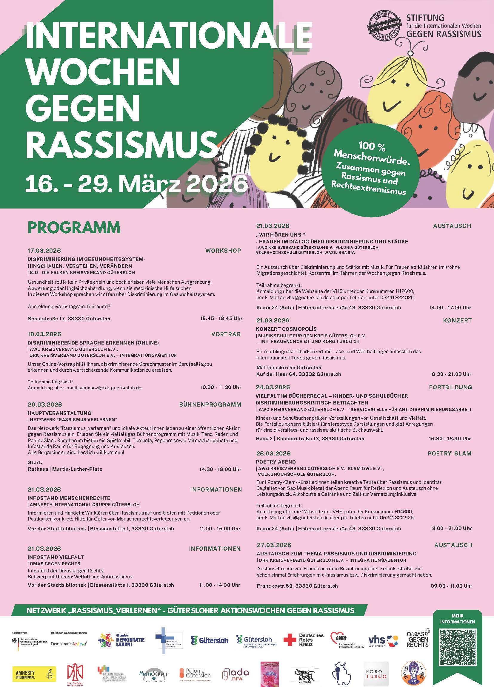 Vom 16. bis 29. März 2026 finden in Gütersloh erneut die Internationalen Wochen gegen Rassismus statt. Unter dem bundesweiten Motto „100 % Menschenwürde. Zusammen gegen Rassismus und Rechtsextremismus“ beteiligen sich zahlreiche regionale Initiativen und Institutionen mit einem abwechslungsreichen Programm. Auch der AK ASYL Gütersloh arbeitet im Netzwerk "Rassismus_Verlernen" mit.