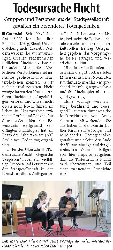 Gütersloh (jhr) - An die denken, an die eigentlich niemand mehr denkt: Das ist die Absicht des Gedenktags für Fluchtopfer am Karsamstag in der Martin-Luther-Kirche gewesen. Der Arbeitskreis Asyl der Evangelischen Kirchengemeinde Gütersloh hatte dazu eingeladen, zwölf Stunden lang Namen von Menschen zu nennen, die auf der Flucht vor Krieg, Armut und Verfolgung gestorben sind.