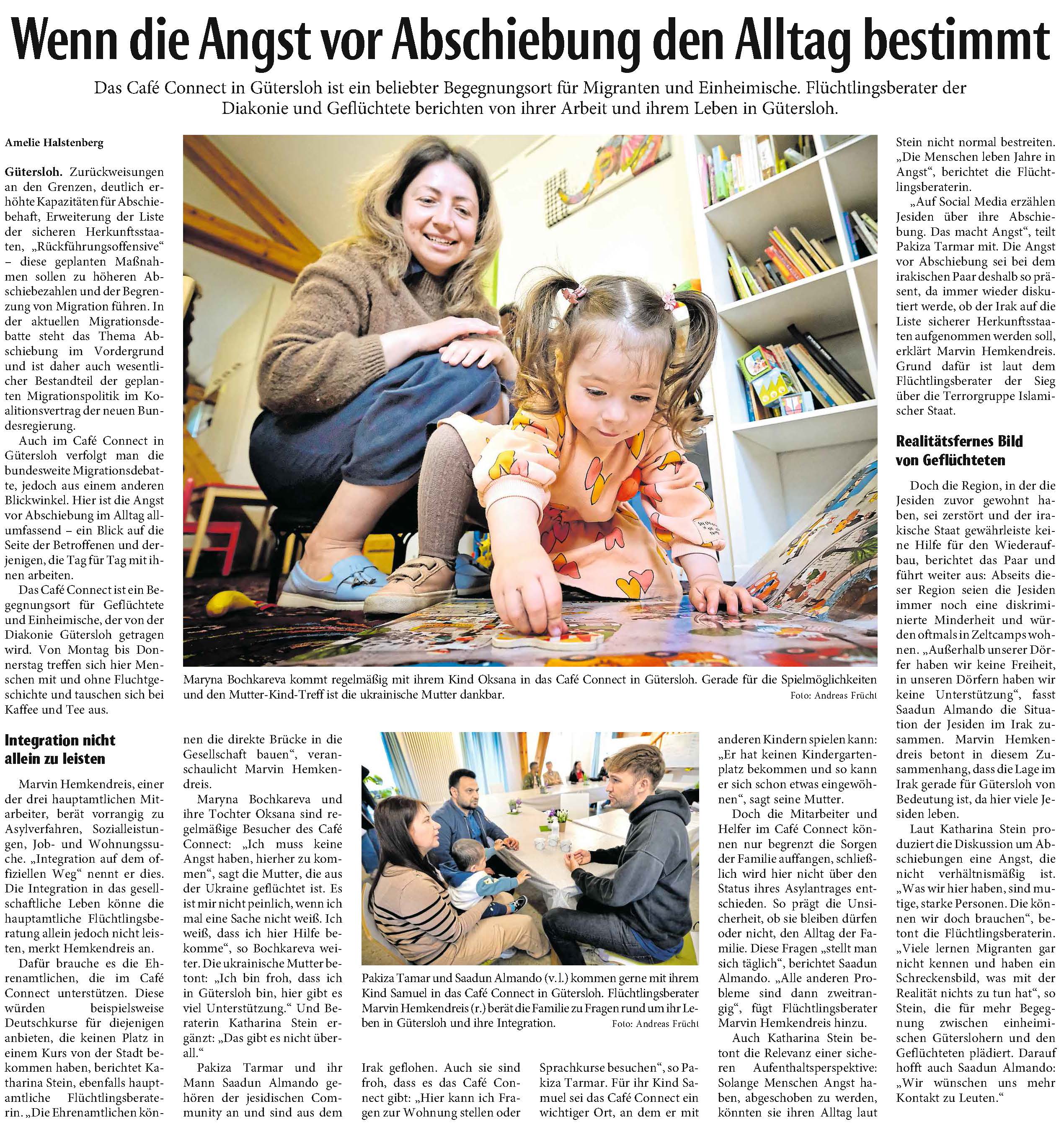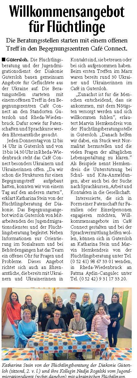 Jetzt lebt sie mit ihrer Familie in einer Wohnung, die ihnen Bekannte vermittelt haben. „Sie haben uns zu der Wohnung verholfen, uns zum Rathaus begleitet, Essenspakete gebracht und vieles mehr – wir sind so dankbar dafür“, sagt die Ukrainerin. Von den Mitarbeitenden im Rathaus hat sie eine Liste mit Stellen bekommen, an die sie sich wenden kann, darunter auch die Flüchtlingsberatung der Diakonie Gütersloh und das Café Connect.