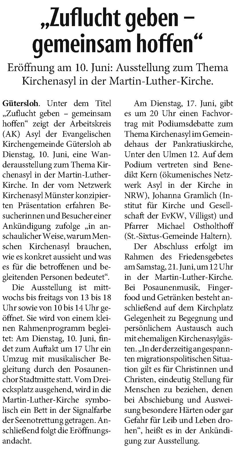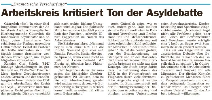 In einer Stellungnahme kommentiert der Arbeitskreis Asyl der Evangelischen Kirchengemeinde Gütersloh die bundesweite Asyldebatte und beklagt „eine dramatische Verschärfung der Tonlage gegenüber Geflüchteten“.