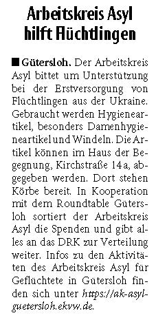 Interessenten sind stets willkommen und finden Informationen und Kontaktdaten auf der Internetseite unter: www.ak-asyl-guetersloh.ekvw.de