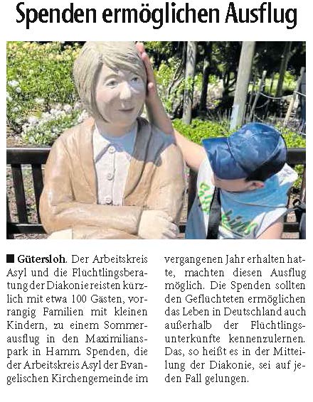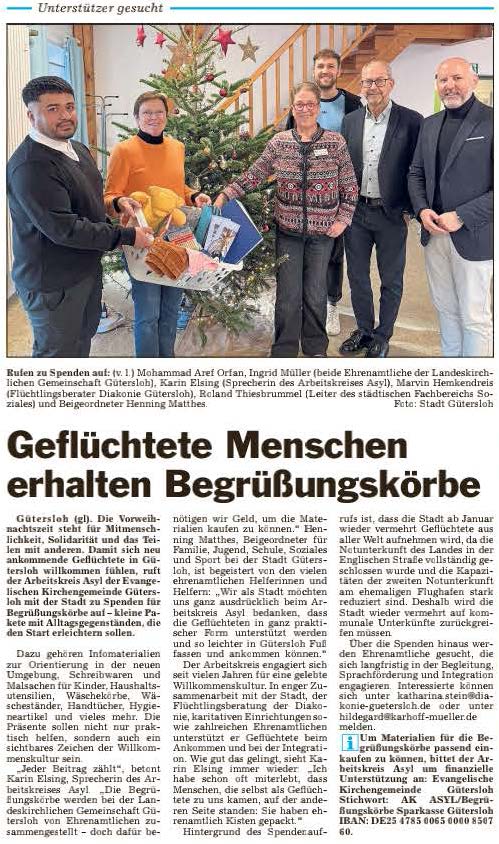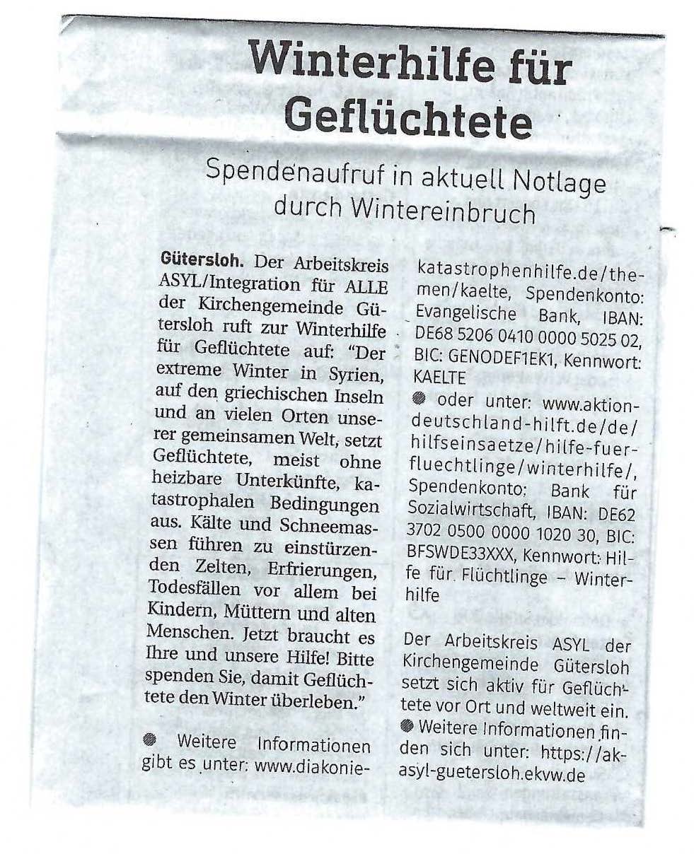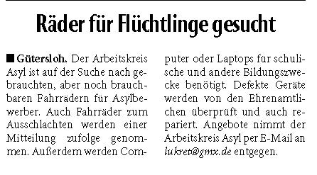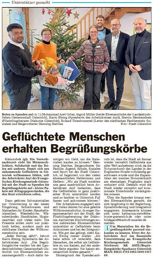 Anlässlich der Spendenübergabe wies die Flüchtlingsberatung der Diakonie darauf hin, dass noch ehrenamtliche Helfer gesucht werden, die sich entweder im Begegnungsangebot der Flüchtlingsberatung oder für eine Patenschaft mit einer geflüchteten Familie engagieren möchten. Interessenten könnten sich gern an die Diakonie Gütersloh wenden; weitere Informationen gibt es unter Tel. 05241 98670.
