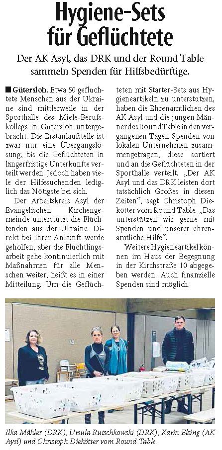 „Der Arbeitskreis Asyl der evangelischen Kirche unterstützt die Geflüchteten in Gütersloh mit viel Engagement und ehrenamtlicher Hilfe. Wir packen hier schon seit einigen Wochen mit Sachspenden für die Flüchtlingsunterkünfte selber mit an, jetzt kommt noch eine Geldspende hinzu“, berichtet Podkocki. „Wir wissen das dieses Geld direkt und lokal verwendet wird und damit die Geflüchteten unterstützt.“ Als weiteres Projekt spendet der Round Table an die Aktion Fruchtalarm. Die Ehrenämtler von Fruchtalarm fahren mit ihrer mobilen Cocktailbar zu den Einrichtungen und mixen frische, alkoholfreie Cocktails für Jung und Alt.
