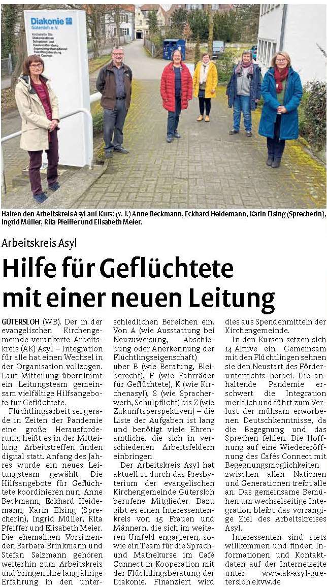 Flüchtlingsarbeit sei gerade in Zeiten der Pandemie eine große Herausforderung, heißt es in der Mitteilung. Arbeitstreffen finden digital statt. Anfang des Jahres wurde ein neues Leitungsteam gewählt. Die Hilfsangebote für Geflüchtete koordinieren nun: Anne Beckmann, Eckhard Heidemann, Karin Elsing (Sprecherin), Ingrid Müller, Rita Pfeiffer und Elisabeth Meier. Die ehemaligen Vorsitzenden Barbara Brinkmann und Stefan Salzmann gehören weiterhin zum Arbeitskreis und bringen ihre langjährige Erfahrung in den unterschiedlichen Bereichen ein. Von A (wie Ausstattung bei Neuzuweisung, Abschiebung oder Anerkennung der Flüchtlingseigenschaft) über B (wie Beratung, Bleiberecht), F (wie Fahrräder für Geflüchtete), K (wie Kirchenasyl), S (wie Spracherwerb, Schulpflicht) bis Z (wie Zukunftsperspektiven) – die Liste der Aufgaben ist lang und benötigt viele Ehrenamtliche, die sich in verschiedenen Arbeitsfeldern einbringen.