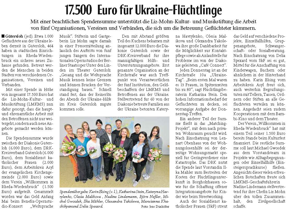 Gütersloh (jed) - Rund 1000 Geflüchtete aus der Ukraine leben derzeit in der Dalkestadt. 464 haben in Städtischen Einrichtungen in Rheda-Wiedenbrück ein sicheres neues Zuhause gefunden. Betreut werden die Menschen in beiden Städten von verschiedenen karitativen Einrichtungen. Mit einer Spende in Höhe von insgesamt 17 500 Euro unterstützt die Liz Mohn Kultur und Musikstiftung die Arbeit der Haupt- und Ehrenamtlichen.