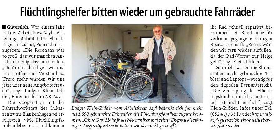 1000er-Marke schnell geknackt GÜTERSLOH (WB). Einen „tausendfachen Dank“ richtet der Arbeitskreis Asyl an alle Spender und Helfer, die es ermöglicht haben, trotz Corona die 1000er-Marke an überlassenen Fahrrädern für die Mobilität geflüchteter Menschen zu erreichen. Im März 2020 startete das Hilfsteam der evangelischen Kirchengemeinde Gütersloh laut Mitteilung den Aufruf zur Radabgabe. Erwünscht sind erneute Fahrradspenden. Infos gibt es im Internet. Ohne den ehrenamtlichen Einsatz von Mechaniker Otto Holdijk und seiner Ehefrau sei die Eintausend nicht geschafft worden, heißt es. Auch die Kooperation mit der Fahrradwerkstatt des Bürgerzentrums Lukas Blankenhagen wird lobend erwähnt. Zudem habe die Stadt Gütersloh für die verloren gegangenen Garagen in der Zeppelinstraße Ersatz beschafft. Angenommen werden neuerdings auch gebrauchte Tablets und Laptops, denn in der Pandemie sei die Versorgung der Flüchtlingskinder mit digitalen Geräten für die Schule nicht einfach, betonen die Aktiven. Weitere Auskünfte erhalten Interessenten unter 05241/33513 oder direkt bei Ludger KleinRidder unter 01522/4348299. Auch im Internet gibt es weitere Informationen zu dem Projekt ■ www.ak-asylguetersloh.ekvw.de/ ueber-uns/fahrraeder