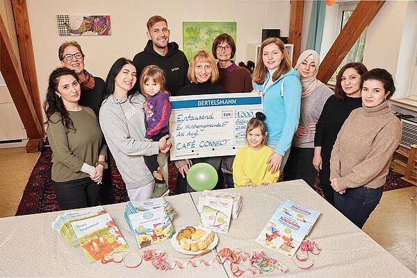 Gütersloh. Seit sieben Jahren besteht das „Café Connect“ als gemeinsames Projekt der evangelischen Kirchengemeinde und der Flüchtlingsberatung der Diakonie. Hier helfen ehrenamtliche Kräfte Menschen, die aus verschiedenen Regionen der Welt geflüchtet sind. Unterstützt werden sie dabei von Bertelsmann: Das Unternehmen spendet jetzt erneut 1.000 Euro sowie zahlreiche, eigens in ukrainischer Sprache aufgelegte Kinderbücher. Vor Kurzem wurde in den Räumlichkeiten des Cafés in der Kirchstraße 10a in Gütersloh der Scheck an Vertreterinnen und Vertreter der Kirchengemeinde und der Diakonie übergeben.