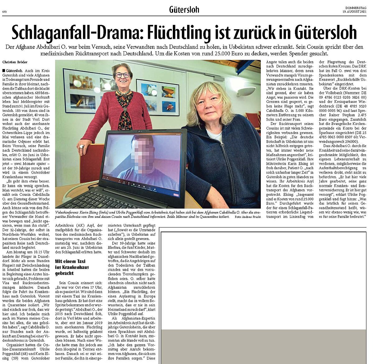 Bei seinem Aufenthalt in Usbekistan erleidet der 39-jährige einen Schlaganfall. Der Gütersloher Arbeitskreis Asyl, der zur Evangelischen Kirchengemeinde gehört, schaltet sich ein. Mit vereinten Kräften holen die Verantwortlichen den Mann zurück nach Deutschland - und bitten jetzt um Spenden, um die Kosten zu decken.